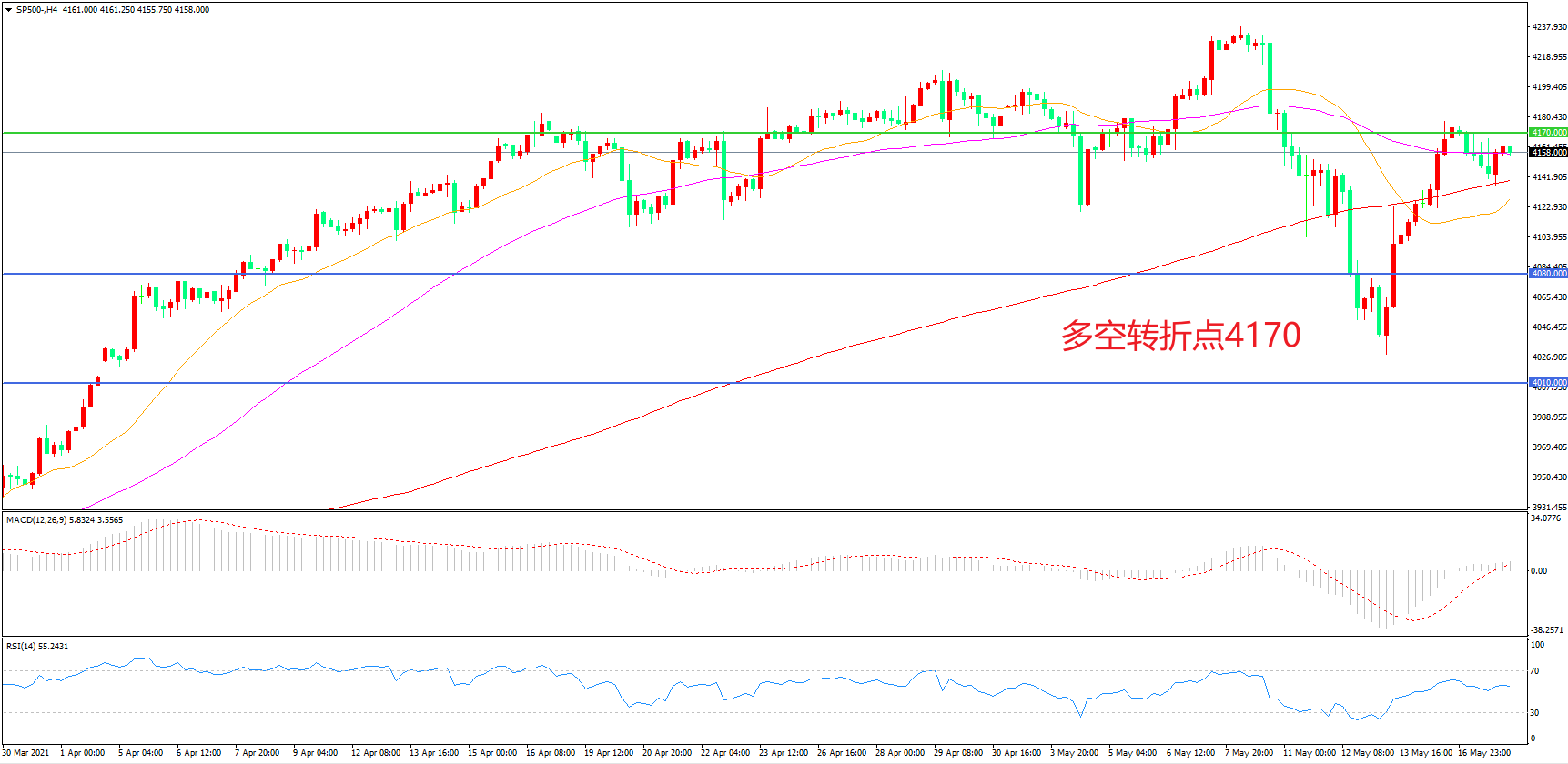 4小时图看,标普500触碰4170后小幅回落,短期暂时暂缓,200周期均线的支撑依然有效,4170成为多空分水岭,MACD红柱增加,RSI指标走平,日内震荡上行概率较大。
