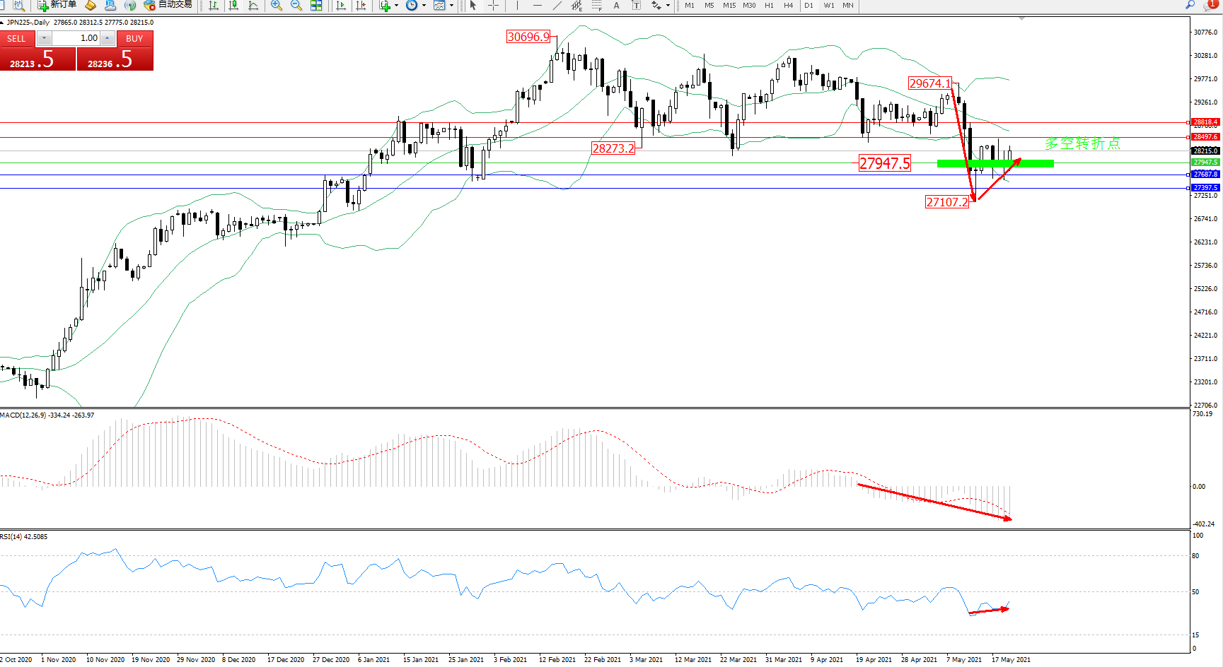技术点评:空头动力急速下挫至27107位置后得到支撑反转上移,纠结于中下轨区间震荡,空头动力维持低位宽幅震荡走势中,布林带指标呈张口走势态势良好,关住下轨内侧关键节点,MACD指标处于0轴线下方空头区域维持震荡持续下移,RSI指标处于50均衡线下方空头区域维持震荡平移中;