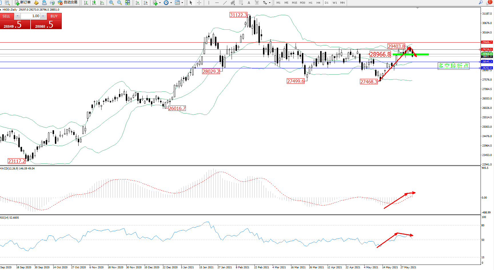 技术点评:低位多头动力持续震荡上扬至布林带指标上轨29403附近遇阻整理,短期徘徊后空头动力伺机入场反转下行,布林带指标呈缓慢张口走势持续中,短期空头或有进一步调整下行迹象,MACD指标处于0轴线上方多头区域维持整理徘徊,RSI指标处于50均衡线上方多头区域维持窄幅震荡后有下行迹象;