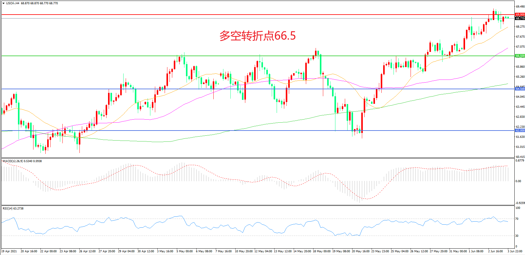 4小时图看,油价延续前期上行走势,整体表现偏强,69美元成为中期阻力,66.5成为下方支撑,均线系统呈多头排列,MACD红柱增加,RSI指标走平,日内震荡上行概率较大。
