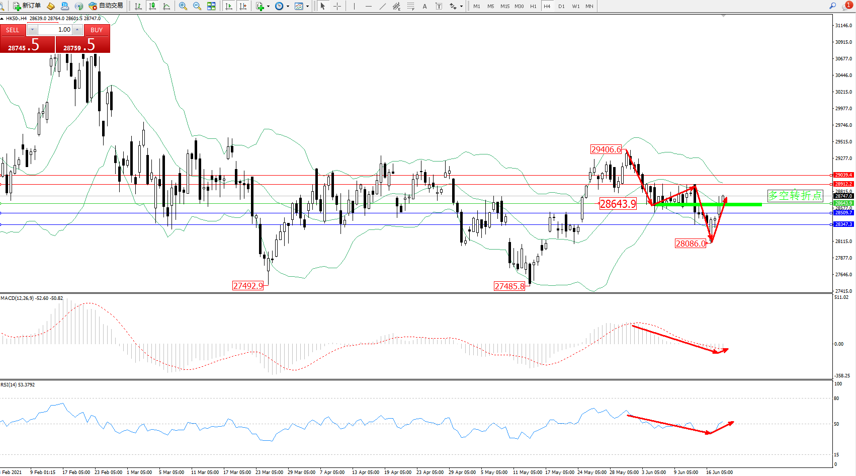 技术点评:空头动力延续布林带指标通道中下轨区间持续震荡下行,低位抵达28086位置后到支撑强势反转上移,突破中轨附近节点后有继续拉升态势,关注布林带指标上轨附近压制节点,布林带指标呈下行趋势走势持续中,有短暂收口迹象,MACD指标处于空头区域下方弱势震荡回升,即将触及0轴线附近,RSI指标低位多头动力持续震荡回升至50均衡线附近整理后开始缓慢上移中;