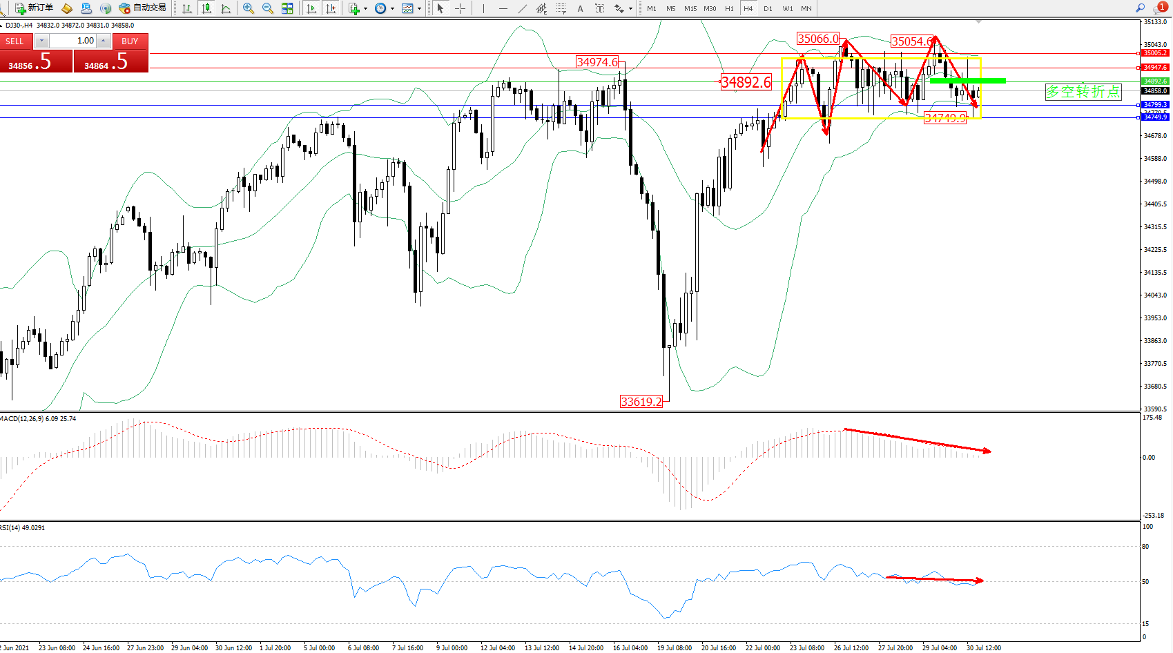 道琼斯指数7月30日(周五)收盘下跌148.40点,跌幅0.42%,报34936.13点;美国股市回落,疫情期在推动股指创新高方面立下汗马功劳的科技股周五走势疲弱,因投资者对大型科技企业的增长放缓感到担忧。科技股令道琼斯指数承压。除了亚马逊以外,Facebook 、苹果发布的业绩展望也偏谨慎,引发了有关科技公司疫情相关业绩表现是否会不敌周期股的讨论。股市下跌,乐观的美国经济数据帮助美元收复本周早些时候的部分失地,近日美联储的鸽派信息令美元长达一个月的涨势暂歇。