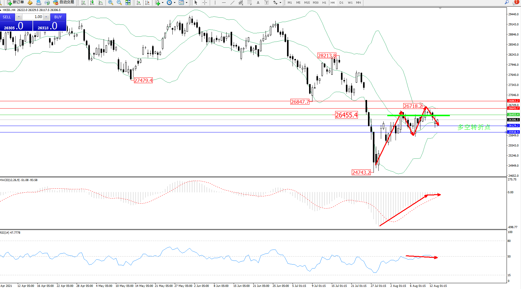 香港恒生指数8月13日(周五)收盘下跌126.2点,跌幅0.48%,报26391.62点;港股主要指数集体收跌,恒生科技指数跌1.93%报6589点。大型科技股普跌,小米跌逾3%,腾讯跌逾2%,阿里巴巴跌2.49%拖累恒指跌超60点。半导体股全天弱势,华虹半导体跌逾8%,中芯国际跌近4%。今日大市成交额为1258亿港元,南下资金净流出2.48亿港元。中国香港第二季度经济同比增长7.6%,预估为7.5%。香港将2021年GDP增长预期调整至5.5%-6.5%。香港特区政府:考虑到上半年实质本地生产总值的强劲表现,以及消费券计划带来的支持,二零二一年实质本地生产总值增长预测由五月时覆检的3.5%至5.5%向上修订至今轮覆检的5.5%至6.5%。鉴于情况发展至今大致符合预期,二零二一年基本消费物价通胀率和整体消费物价通胀率的预测在今轮覆检分别维持在1%及1.6%,与五月时覆检相同。7月份,外汇基金的境外资产增加256亿港元,至40389亿港元。