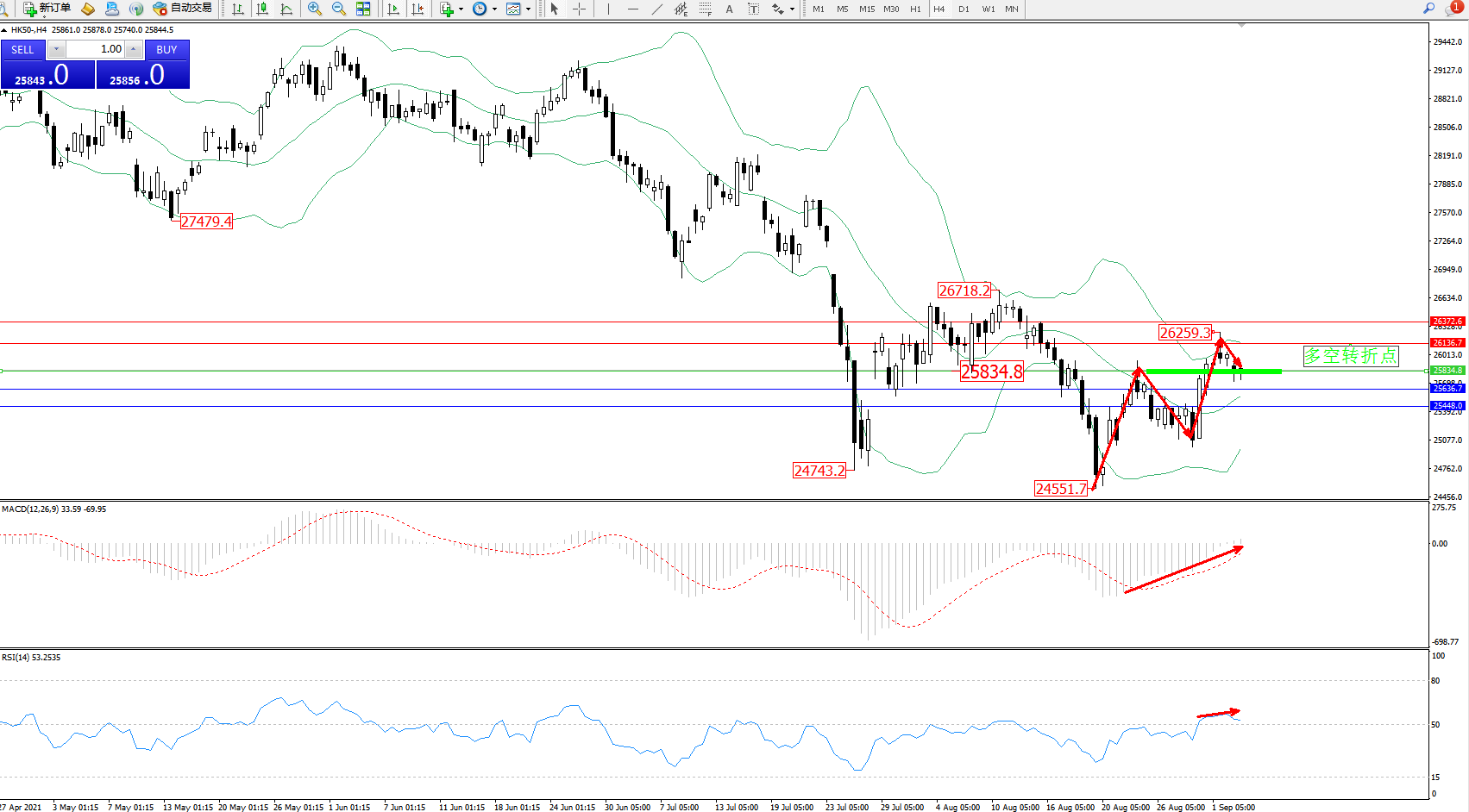 技术点评:低位多头动力呈阶梯式震荡上扬,突破布林带指标上轨至26259位置后遇阻回撤,短期纠结于中上轨区间窄幅整理中,布林带指标呈收口走势持续中,MACD多头动力上行至0轴线附近弱势徘徊,RSI指标纠结于50均衡线上方弱势整理中;