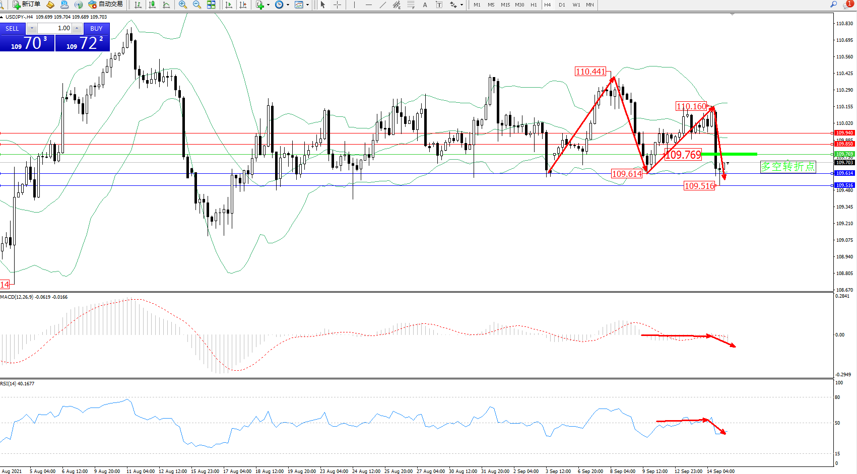 交易策略:109.769下方看跌,目标109.614、109.516