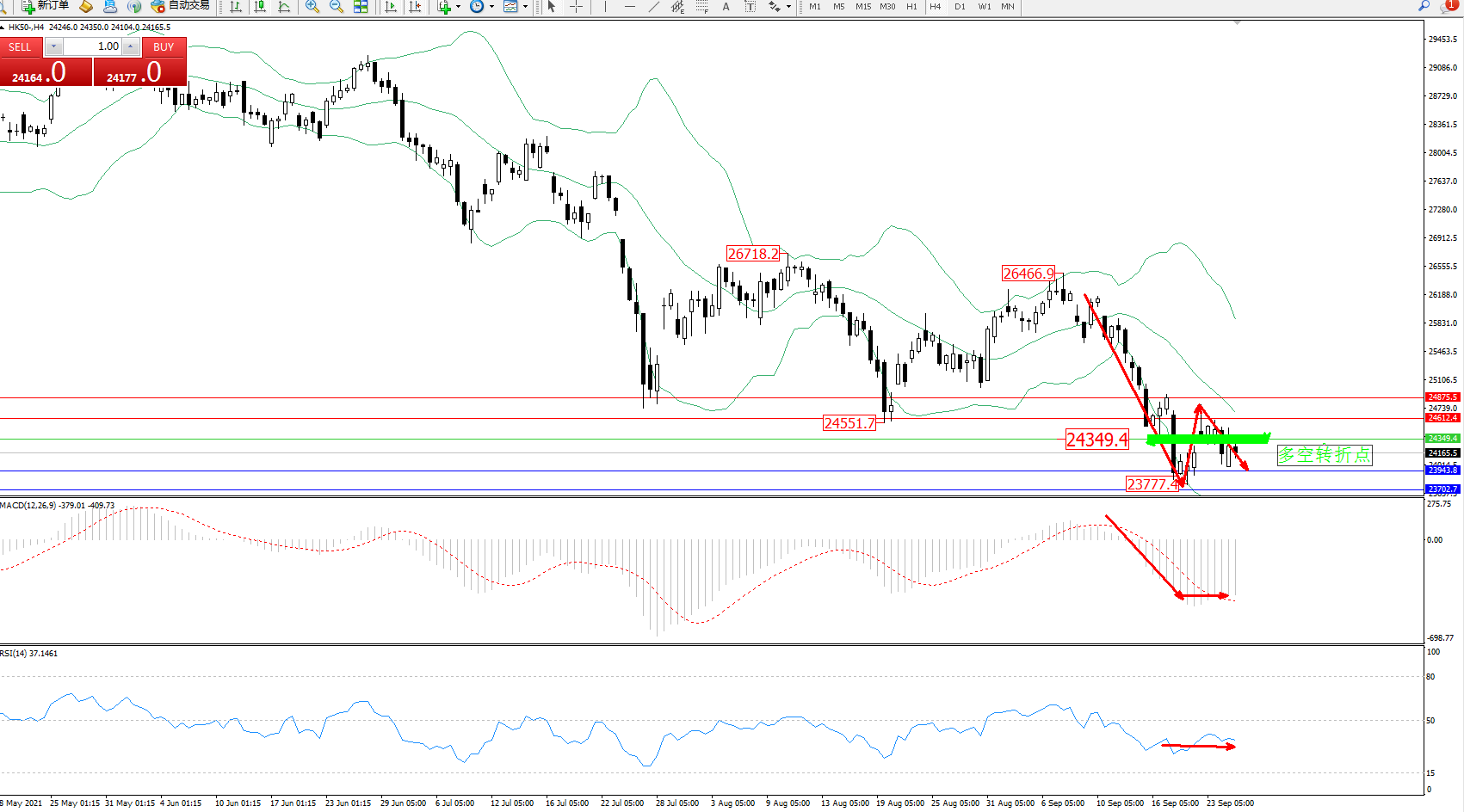 香港恒生指数9月27日(周一)收盘上涨16.62点,涨幅0.07%,报24208.78点;港股午后走弱,恒生科技指数一度跌超1.3%,集装箱现货运价连续第三周涨幅放缓,港口航运股大跌居前,恒大概念股走势分化,中国恒大大涨8%,恒大汽车大跌9.4%。大型科技股涨跌参半,网易、美团涨1.6%,快手大跌6.2%,小米、阿里巴巴跌1.6%。今日大市成交额为1489亿港元,南下资金净流入39.13亿港元。大摩发研报指,中国内地及澳门近日新增的新冠肺炎确诊病例,损害10月份博彩业的前景,短期料疲弱;而随着赌牌的更新,以及新的放宽旅行政策的出现,预期赌业股明年可跑赢。该行指出,澳门赌业股年初至今的表现,落后恒指同期表现34%,而由于赌牌续期和旅行限制的不确定性,预计赌股短期内随指数波动。短期内,该行更喜欢大型股,如银河娱乐(0027.HK)和金沙中国(1928.HK),而不是小型股如美高梅中国(2282.HK)及澳博控股(0880.HK)。而该行亦更为喜欢本地营运商,而非美国支持的营运商。