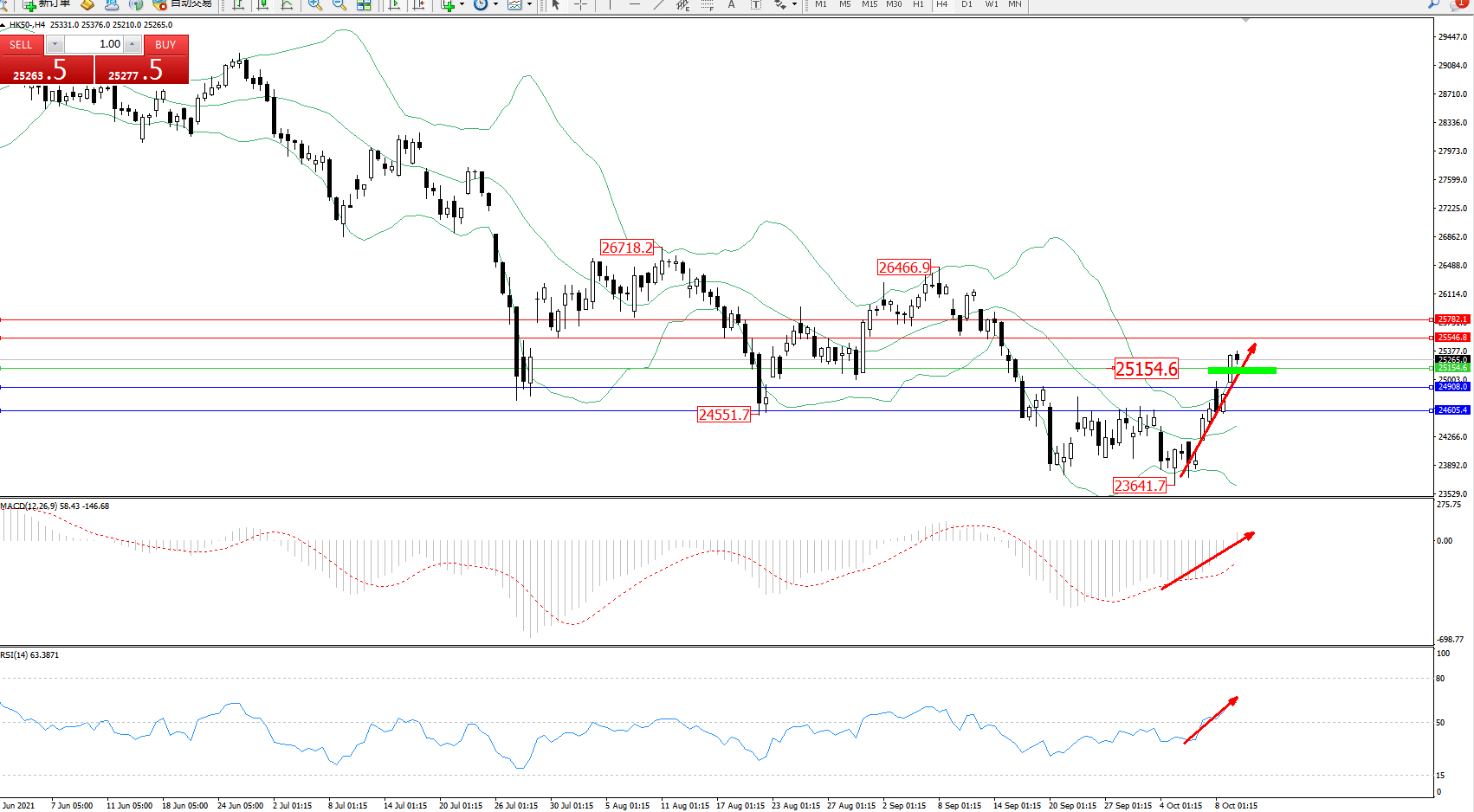香港恒生指数10月11日(周一)收盘上涨487.24点,涨幅1.96%,报25325.09点;港股持续反弹,三大指数全天表现强势,权重科技股再度领衔走高,市场整体情绪较佳,恒生科技指数涨3.17%报6403点。大型科技股美团大涨8.36%,3日连涨超20%,阿里巴巴大涨7.9%,两者助力恒指上扬超320点,百度亦大涨6.4%,腾讯、网易、小米皆走强;煤炭股、航空股、手游股、汽车股、军工股、内险股、餐饮股、内银股现普涨行情,招商银行升近5%;今日大市成交额为1629亿港元,南下资金净流入32.68亿港元。绿色和可持续金融跨机构督导小组欢迎并全力支持《香港气候行动蓝图2050》。香港证券及期货事务监察委员会行政总裁兼督导小组联席主席欧达礼先生表示:“香港作为国际金融中心,在融通资本以落实《香港气候行动蓝图2050》所详述的四大减碳策略和措施方面,担当着重要角色。香港将继续巩固其作为亚洲和内地(包括粤港澳大湾区)的绿色金融中心的地位,让国际投资者与内地市场互相连系。”