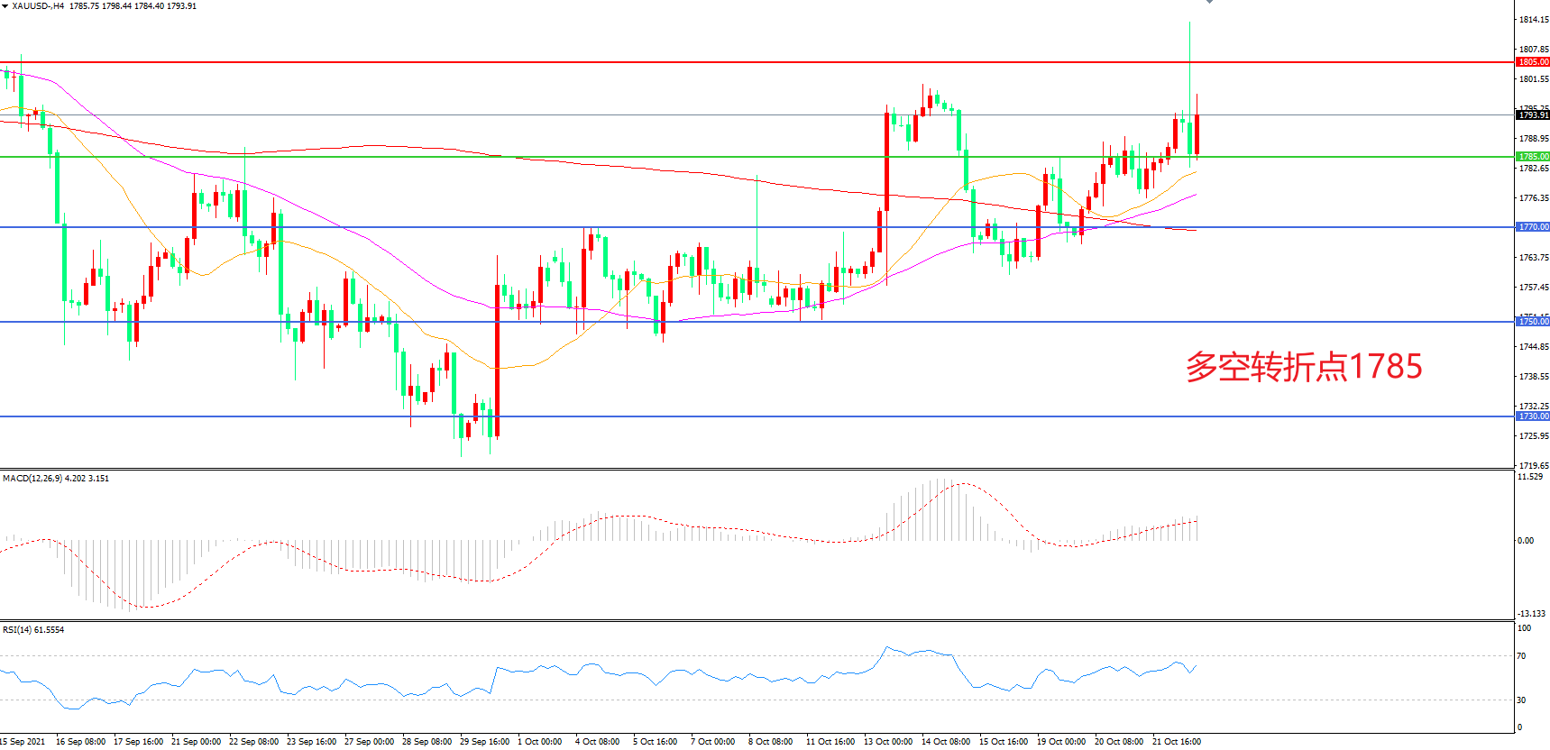 上周五(10月22日),美联储主席鲍威尔发布了月内最后一次公开讲话,他声称Taper将在明年中旬完成,美元指数承压下行,金价冲高回落,收报1793.91美元/盎司。目前市场已经消化美联储在11月份启动缩减购债的预期,投资者仍在试图评估美元是否会进一步下跌,如果美元承压下行,将对金价形成明显支撑。