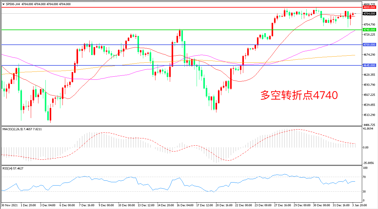 周一(1月3日),2022年新年首个交易日,市场风险情绪有所提振,标普500先跌后涨,收报4784点。目前市场处“拉锯”状态的原因是,一方面,投资者相信今年的经济可以克服新冠疫情激增,一方面美联储将迎来近年来的首次加息,且今年至少加息三次,在这样的环境下,基本面事件的影响力将被放大,重点关注本周美联储会议纪要和非农表现。
