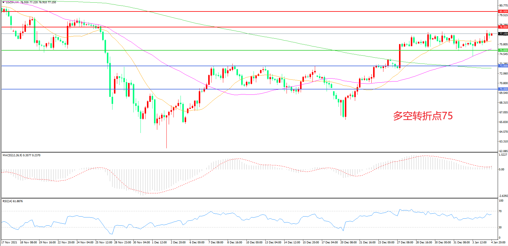 4小时图看,油价延续区间震荡,整体表现偏强,75美元成为下方支撑,78美元成为上方阻力,MACD红柱缩短,RSI指标走平,日内延续震荡概率较大。