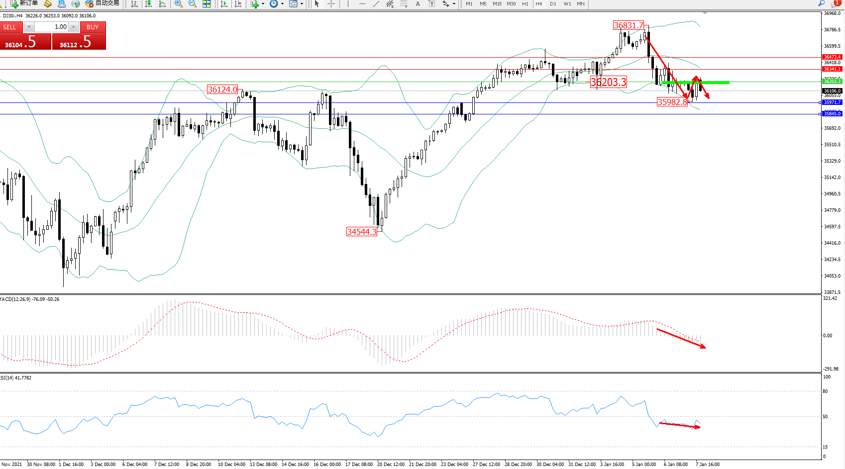 技术点评:空头动力延续布林带指标通道中下轨区间持续震荡下行,短期抵达35982位置后得到支撑震荡,布林带指标呈张口走势后开始有收口迹象,MACD指标处于0轴线下方空头区域维持整理下行,RSI指标处于50均衡线下方空头区域持续震荡中;