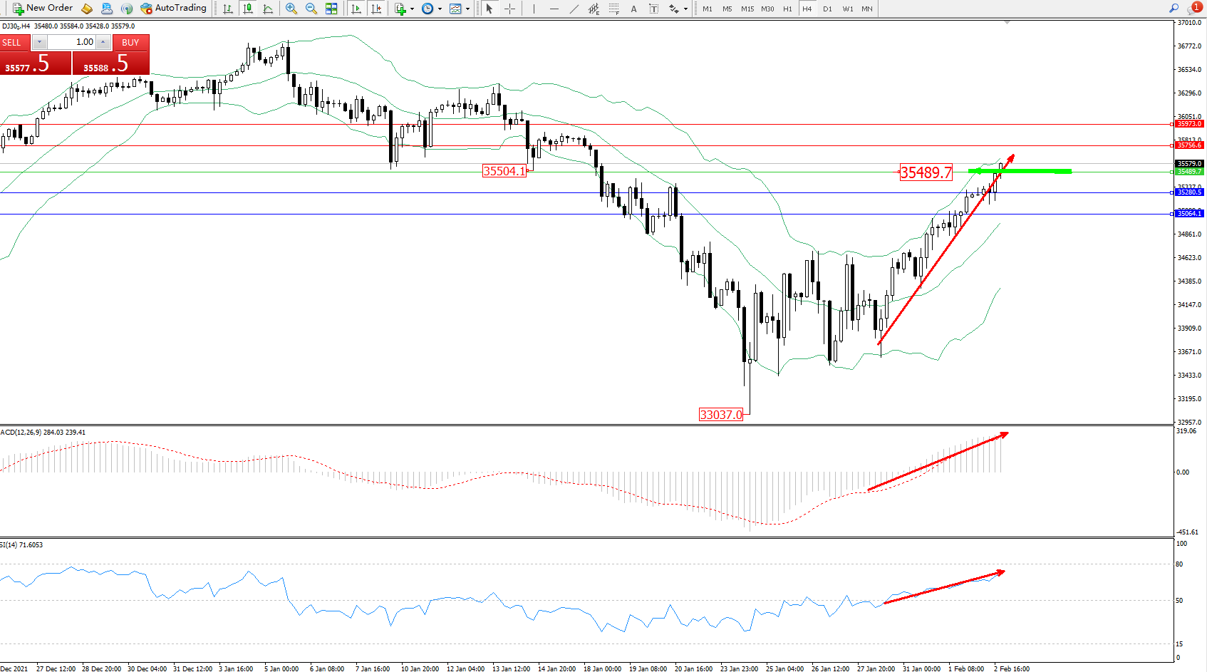 交易策略:35489上方看涨,目标35756、35973