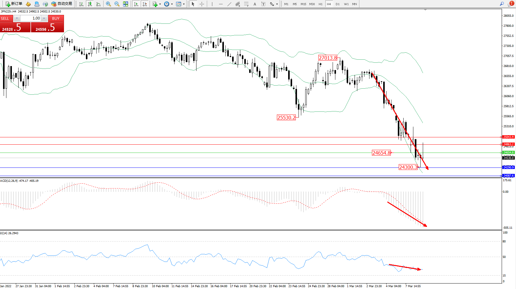 日经225指数3月8日(周二)收盘下跌447.91点,跌幅1.78%,报24773.50点。日本央行行长黑田东彦:成本驱动型通胀不伴随着工资上涨,不会带来2%的可持续通胀。日本央行希望实现通胀适度上升的局面,与此同时企业利润和工资也实现增长。缺乏工资增长的成本推动型通胀将损害家庭实际收入和企业利润,并对日本经济产生负面影响。即使能源、大宗商品成本推高通胀,也不适宜收紧政策和撤回刺激措施。不能肯定俄罗斯不会出现债务违约。预期中的美联储加息可能不会让亚洲新兴经济体陷入严重困境。