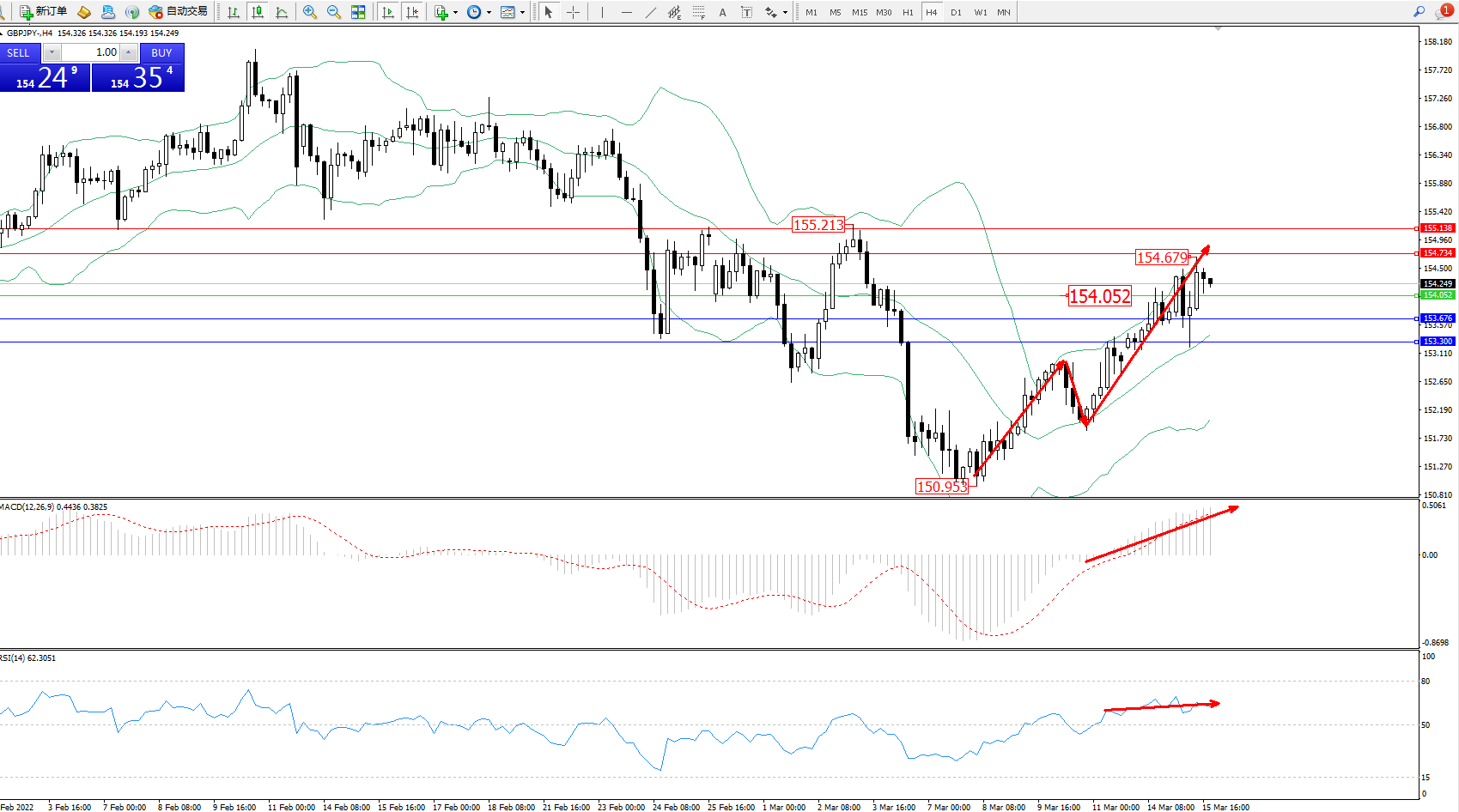 交易策略:154.052上方看涨,目标154.734、155.138