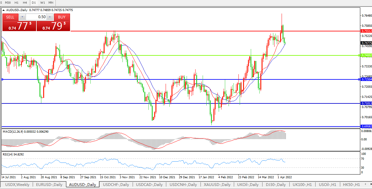 交易策略:0.7400上方看涨,目标0.7550、0.7650