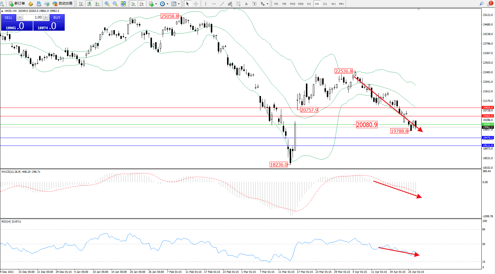 技术点评:空头动力延续布林带指标通道中下轨区间持续震荡下行,短期低位抵达19788位置节点后整理,多头动力有伺机入场迹象,但市场整体下行趋势态势良好,布林带指标呈向下移动走势持续中,MACD指标处于0轴线下方空头区域维持震荡下行,RSI指标处于50均衡线下侧维持弱势下挫;