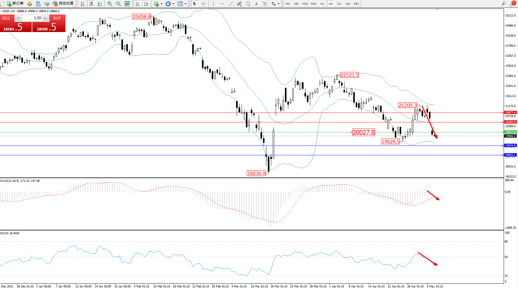 香港恒生指数5月6日(周五)收盘下跌791.44点,跌幅3.81%,报20001.96点;受隔夜美股大跌影响,港股今日呈单边下跌行情,热门板块全部下挫,市场整体情绪表现较差。恒生科技指数跌5.23%。大型科技股引领大市走低,百度、阿里巴巴、京东跌超6%,快手跌5.8%,腾讯、美团跌4.7%;互联网医疗股继续大跌,港股地产股走低,彭博中国地产股指数跌幅扩大至4%。碧桂园跌近10%,旭辉跌逾8%,新城发展控股、中国海外发展跌逾7%,中国金茂、绿城中国、龙光集团跌逾6%。今日南下资金逆势净流入34.02亿港元,大市成交额为1178亿港元。