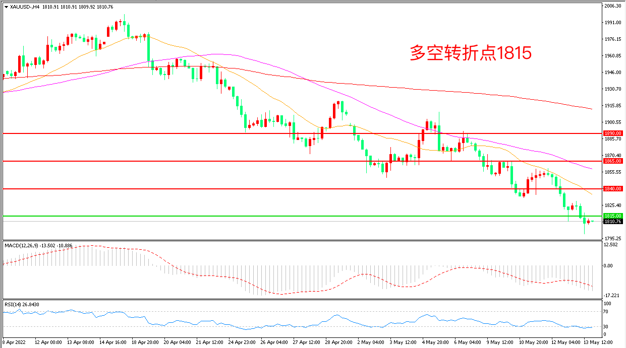 上周五(5月13日),美联储强硬姿态促使美国实际利率和国债收益率上涨,美元指数站上105关口,续刷2002年12月以来新高,现货黄金一度跌破1800美元关口后反弹,收报1810.85美元/盎司。目前金价疲软很大程度上是由于美联储可能会采取更激进的举措,如果美联储坚持强势表态,金价延续低位震荡形态概率较大。