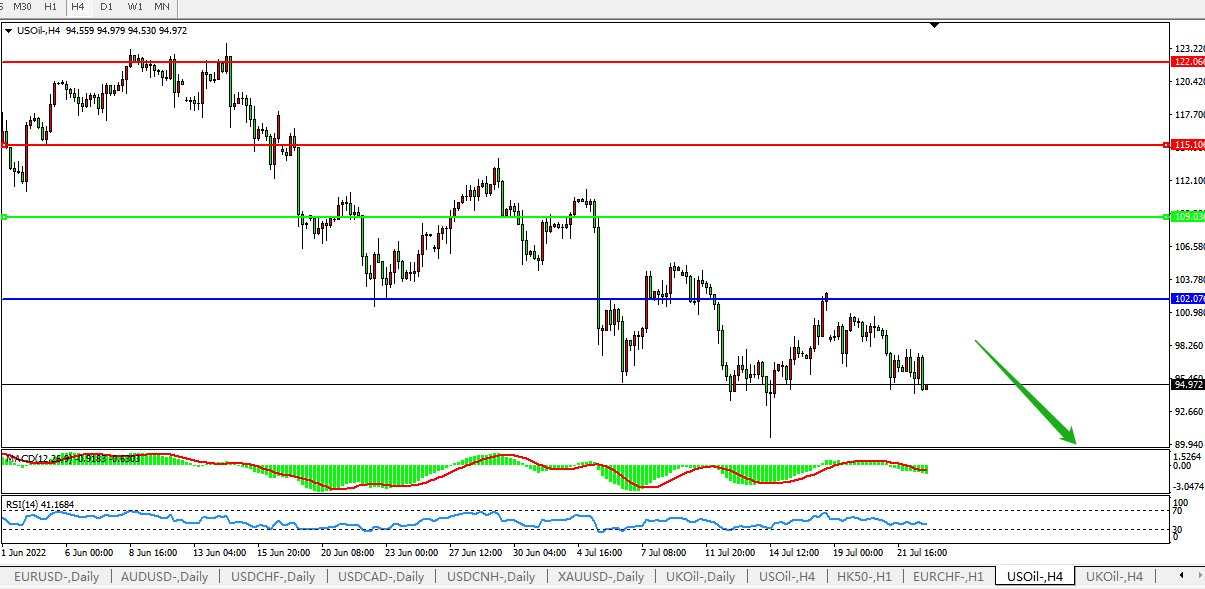 4小时图看:短线价格反弹后再度转弱, MACD量能柱0轴下缩量,RSI指标小幅走弱,短期价格继续下行概率较大。