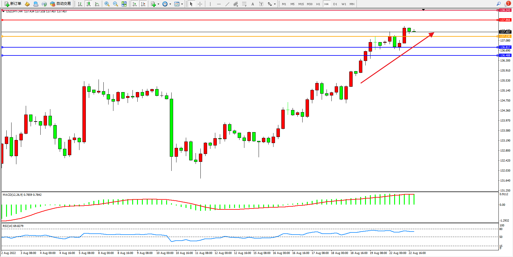4小时图看:多头动力维持震荡上扬态势良好,短期拉升走势或将延续,市场看涨情绪持续,且未见有止步迹象,MACD指标处于多头区域高位徘徊,RSI指标处于多头区域高位窄幅整理;