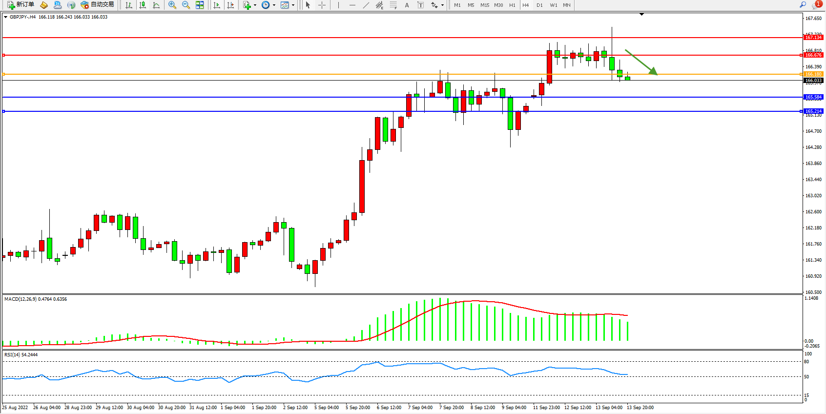 备选策略:166.180上方看涨,目标166.676、167.134