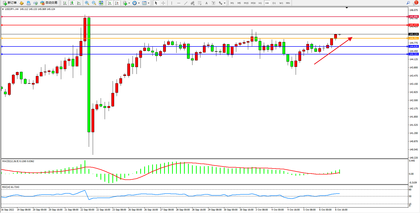 4小时图看:多头动力维持高位区间震荡后,开始缓慢向上突破,多头情绪开始缓慢涌现,MACD指标处于0轴线上側徘徊,RSI指标处于50均衡线上側窄幅整理;