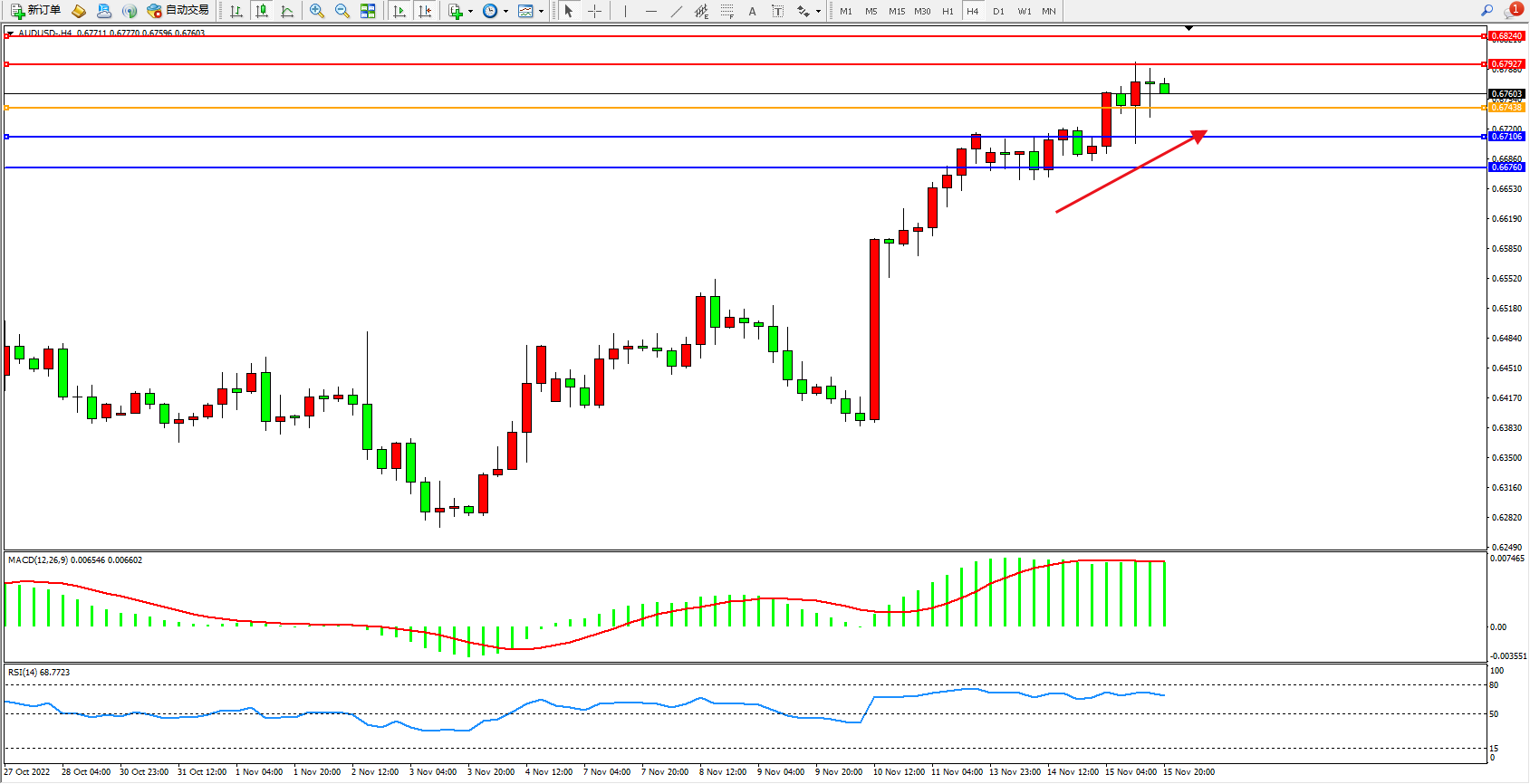 4小时图看:多头动力延续上行趋势不断震荡上移,短期看涨情绪持续,且未见有止步迹象,MACD指标处于多头区域高位整理,RSI指标处于多头区域维持徘徊;