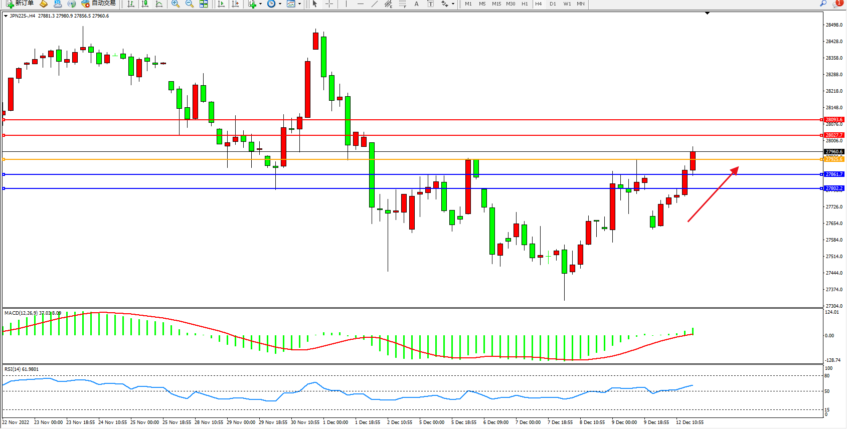 日经指数JPN225——4小时K线图显示: