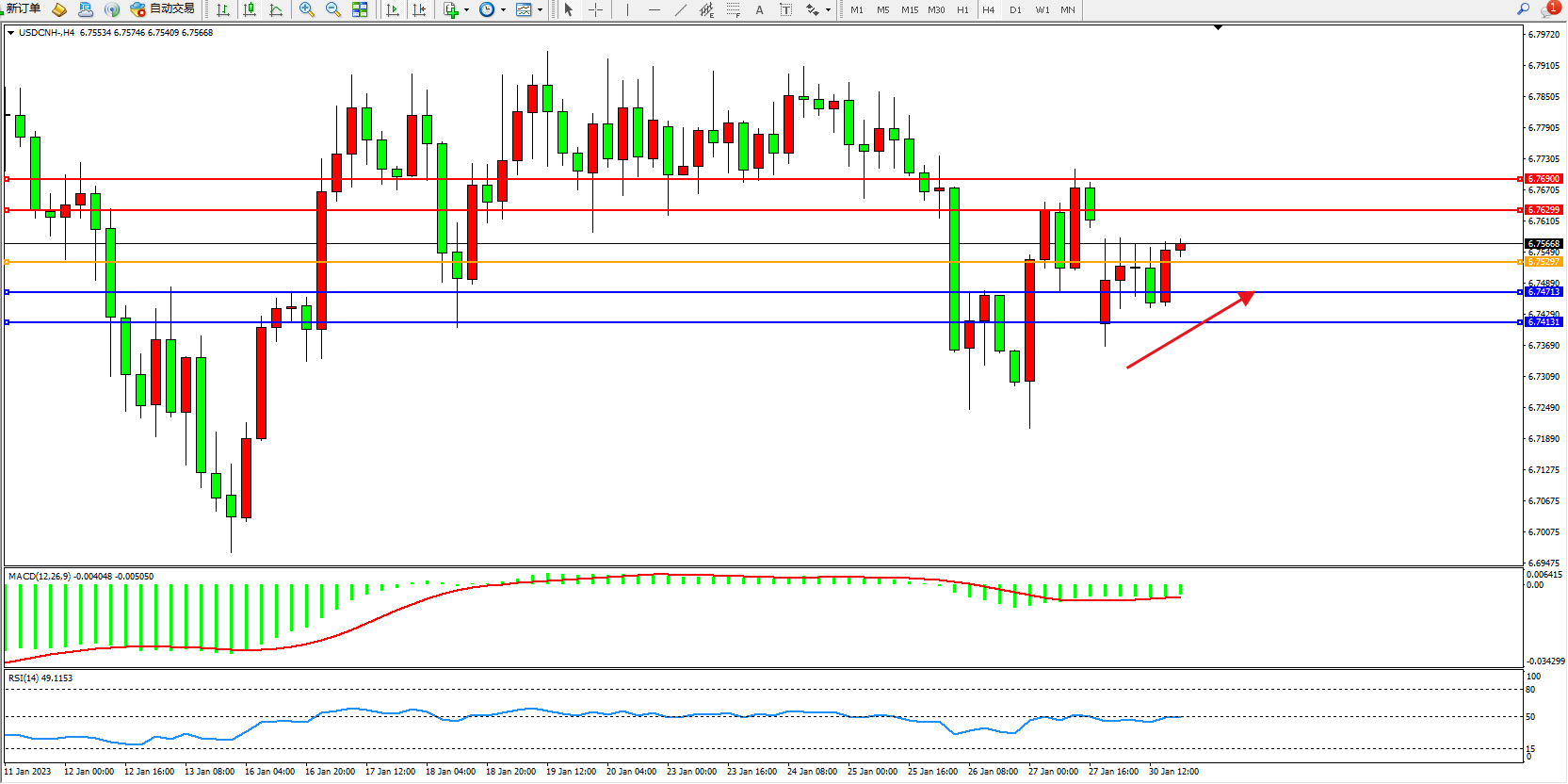 交易策略:6.75297上方看涨,目标6.76299、6.76900