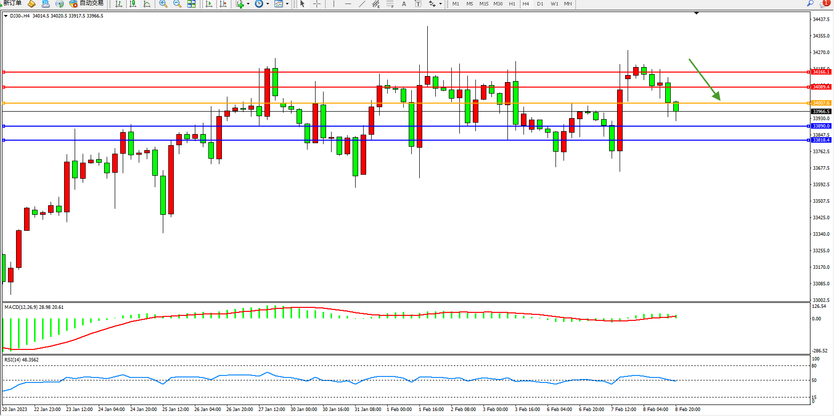 道琼斯指数2月8日(周三)收盘下跌207.49点,跌幅0.61%,报33949.20点;美联储主席鲍威尔隔夜发表的讲话未能展示鹰派态度,市场等待更多经济数据以指导未来政策走向。