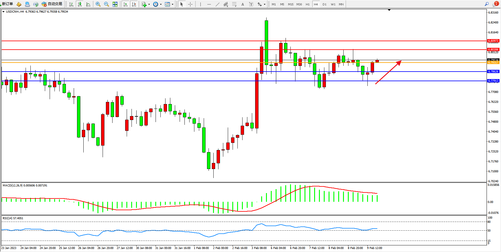 交易策略:6.79317上方看涨,目标6.80306、6.80973
