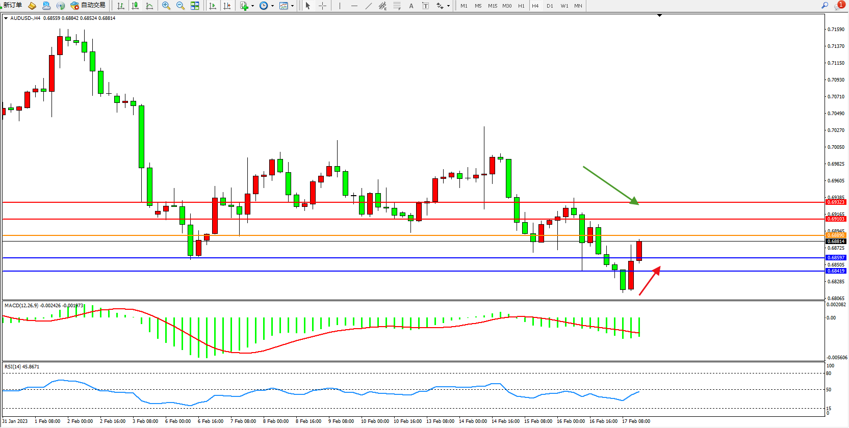 交易策略:0.68890下方看跌,目标0.68597、0.68419