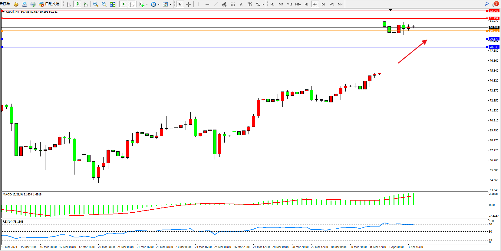 4小时图看:高位跳空高开后整理,市场整体处于高位多头不断震荡中,多头情绪笼罩,MACD指标处于多头区域持续上移,RSI指标处于超买区80均衡线附近徘徊;
