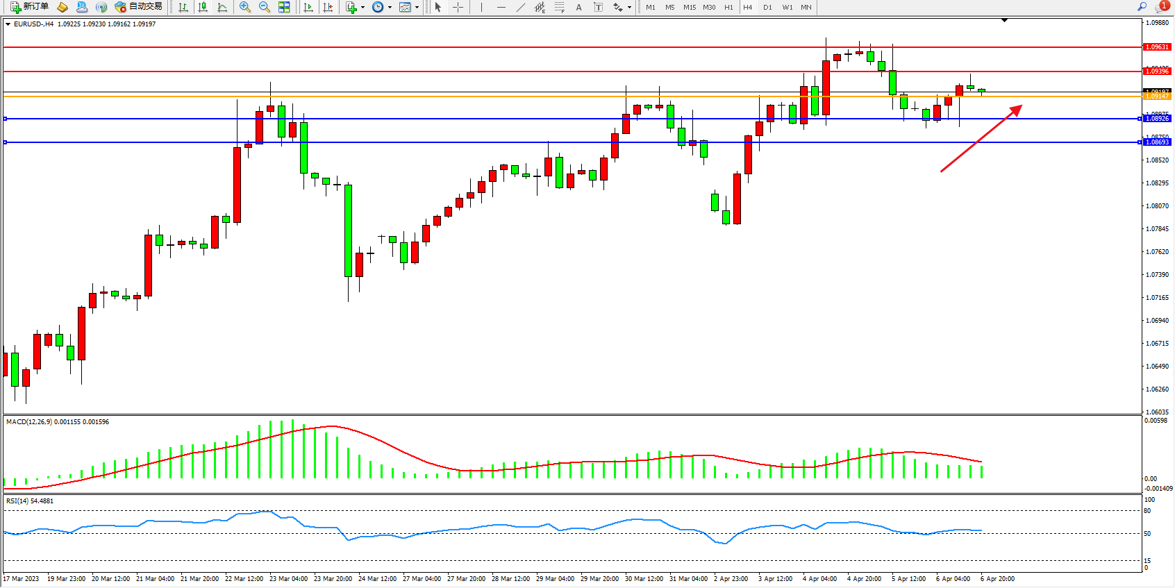 欧元美元EURUSD—4小时K线图显示: