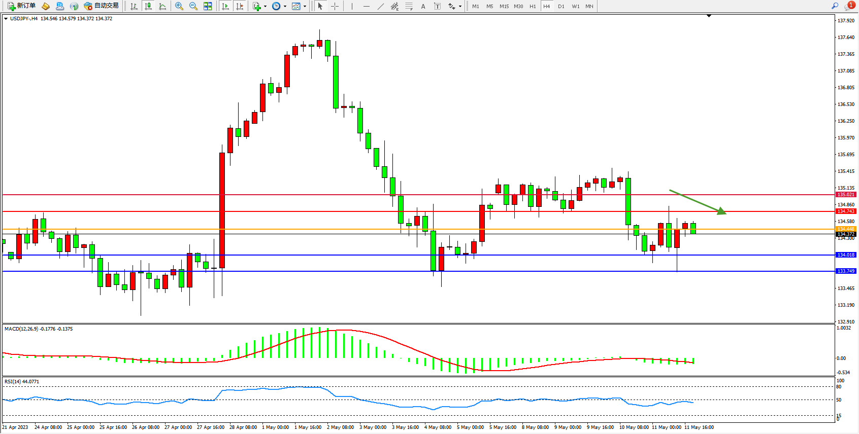 4小时图看:低位窄幅震荡,市场空头情绪开始减弱,但依旧有进一步向下移动态势,,MACD指标处于0轴线下侧弱势整理,RSI指标处于50均衡线下侧弱势徘徊;
