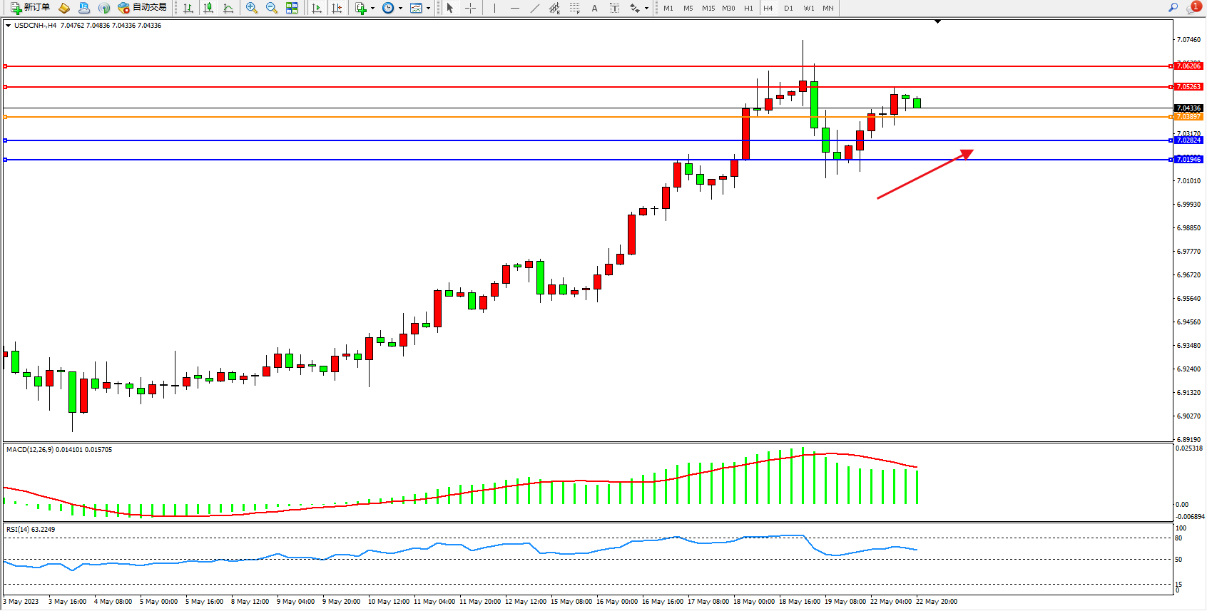 交易策略:7.03897上方看涨,目标7.05263  7.06206