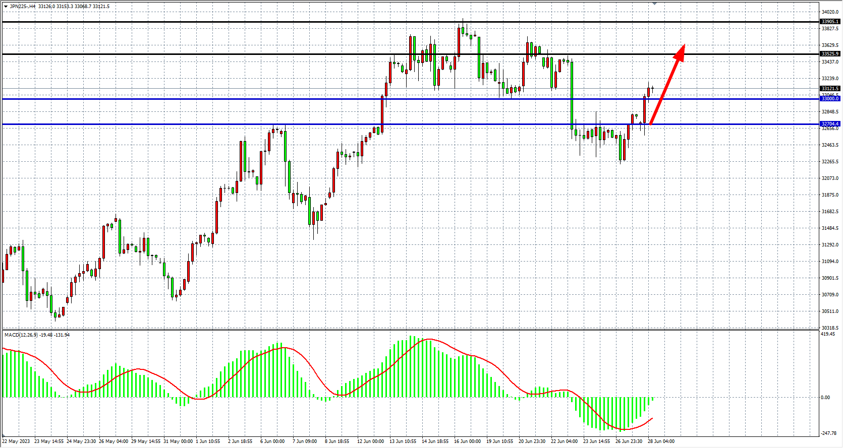 4小时图看,日经指数进一步走高上破33000,MACD量能即将上穿零轴,行情反弹强势,阻力关注33500-33900,支撑关注33000、32700。