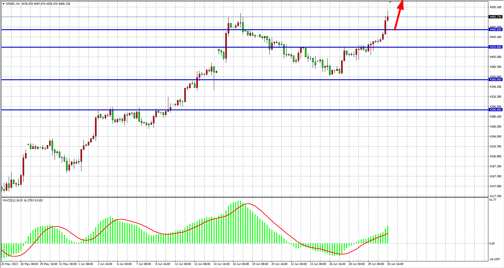 4小时图看,标普进一步突破4470,MACD量能零轴上延续放量,行情延续上涨势头,支撑关注4460,该位之上继续看涨4500-4550。