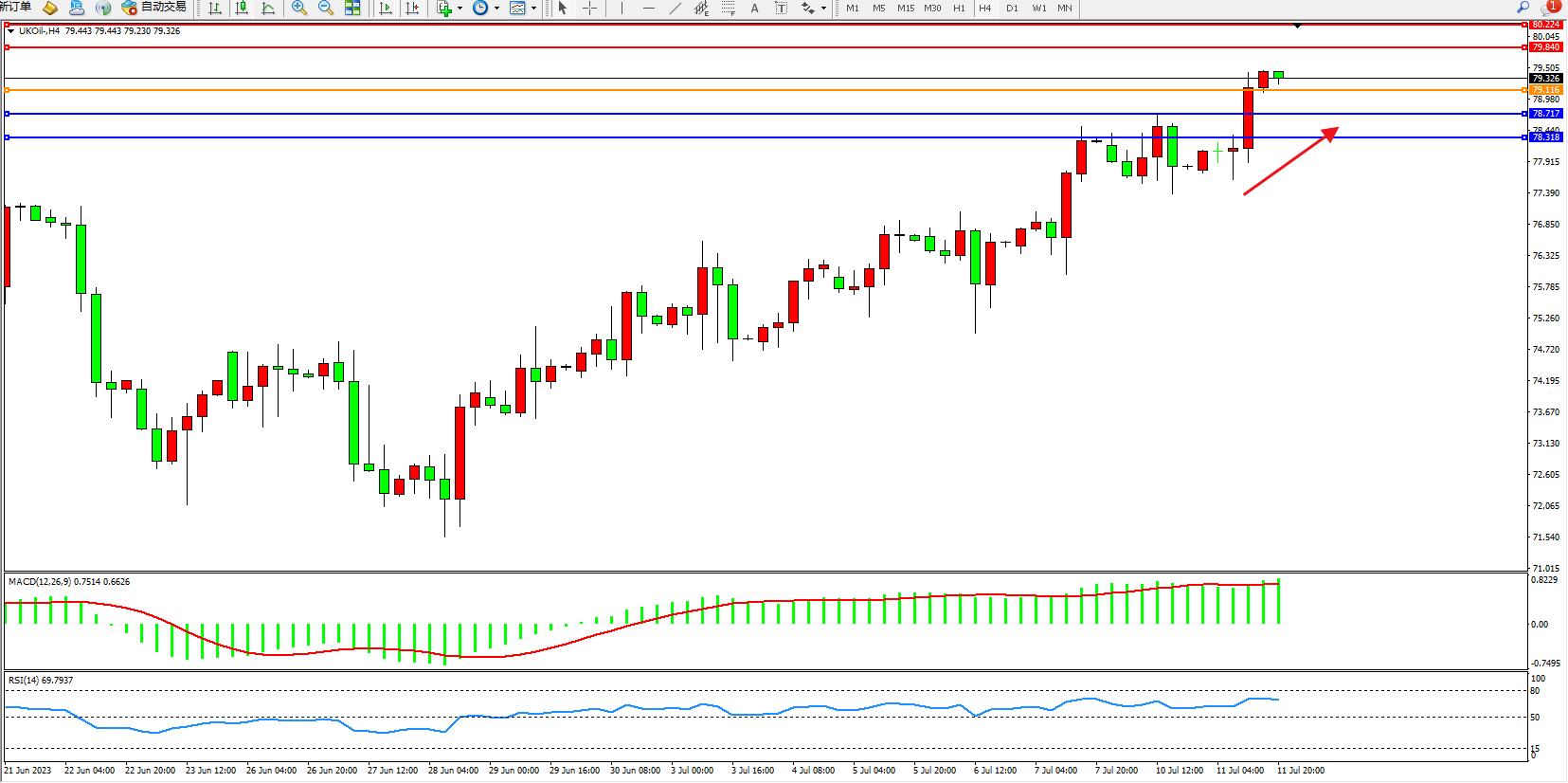 布油维持79.326附近震荡,全球最大石油出口国沙特阿拉伯和俄罗斯定于8月份进一步削减供应,有助于提振价格,美元疲软使得原油对于其他货币持有者来说更加便宜,并且往往会提振石油需求。