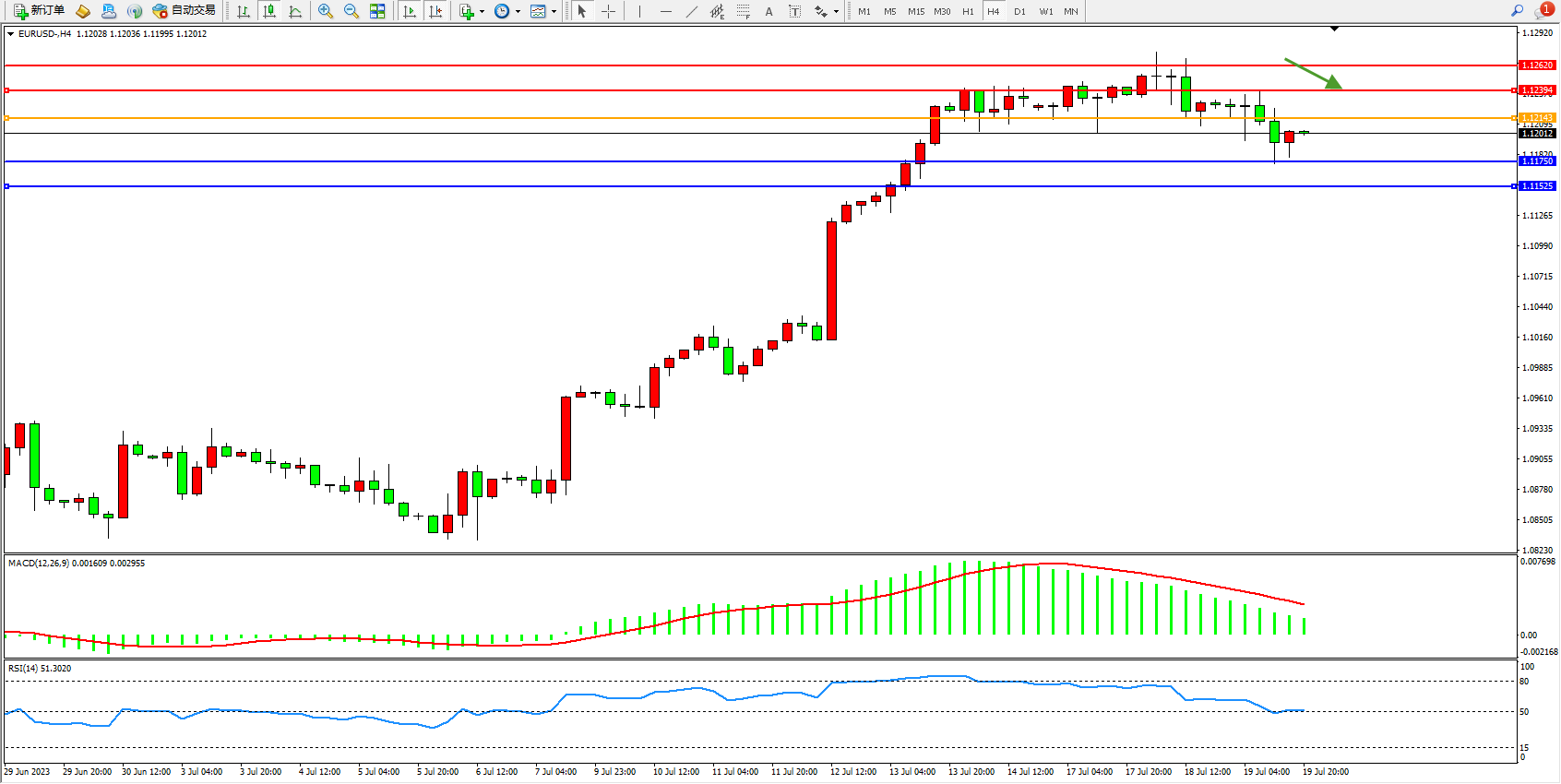 欧元美元EURUSD—4小时K线图显示: