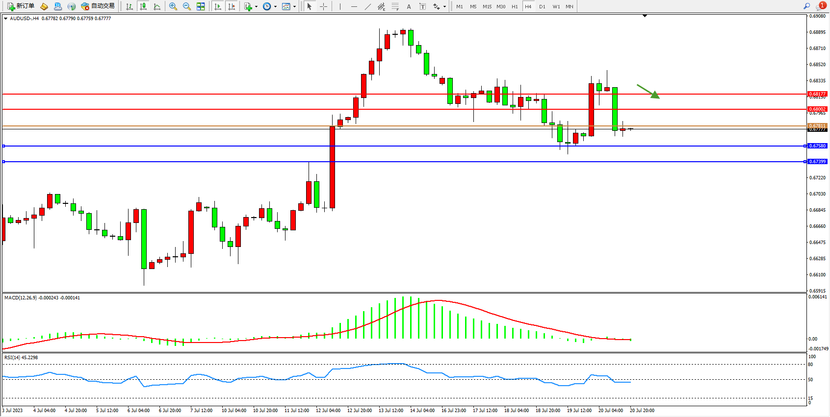 交易策略:0.67811下方看跌,目标0.67580 0.67399