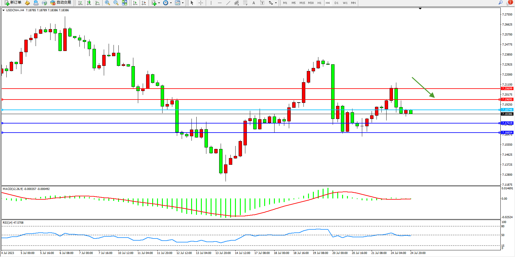 备选策略:7.18746上方看涨,目标7.19695  7.20699