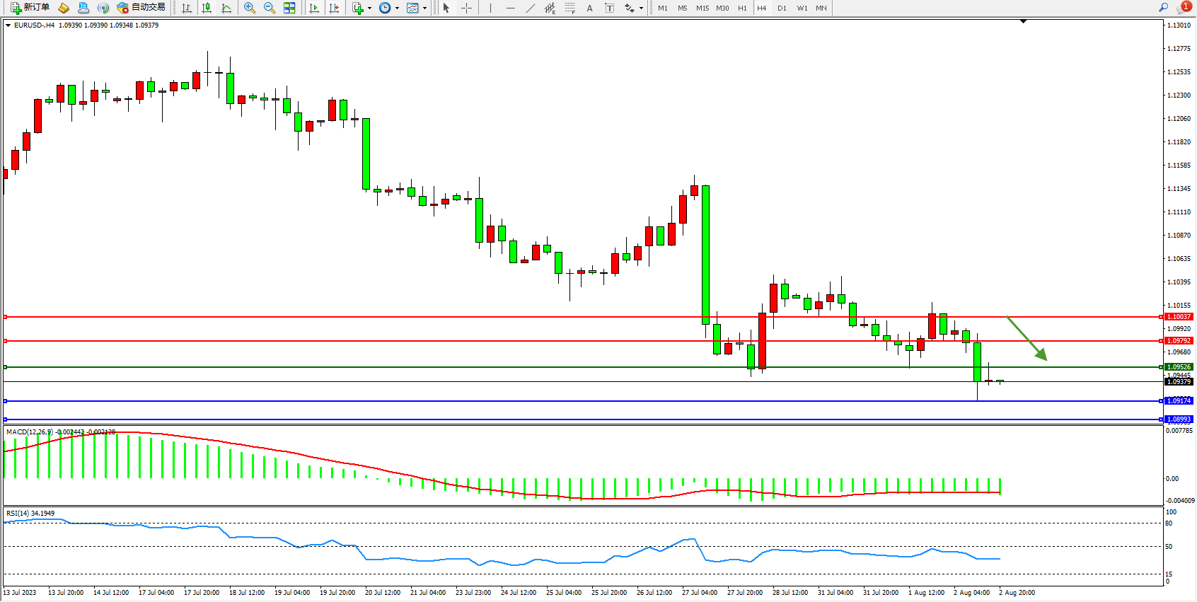 4小时图看:空头动力低位震荡下行,短期跌势或将延续,市场空头情绪笼罩,MACD指标处于空头区域维持整理,RSI指标处于空头区域维持徘徊;