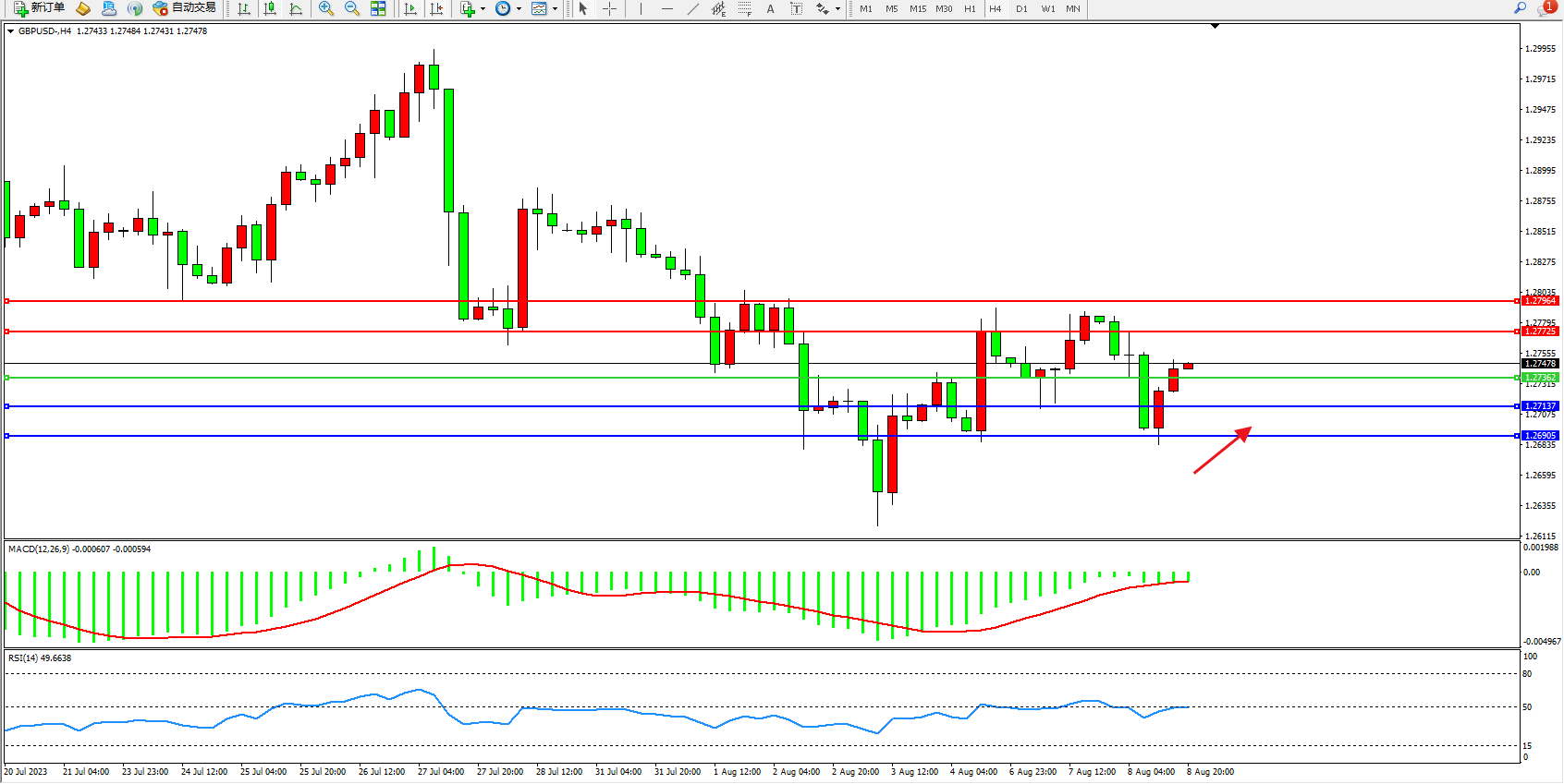 4小时图看:短期多头动力维持震荡上移,市场多头情绪开始涌现,MACD指标处于0轴线下侧弱势整理,RSI指标处于50均衡线附近徘徊;