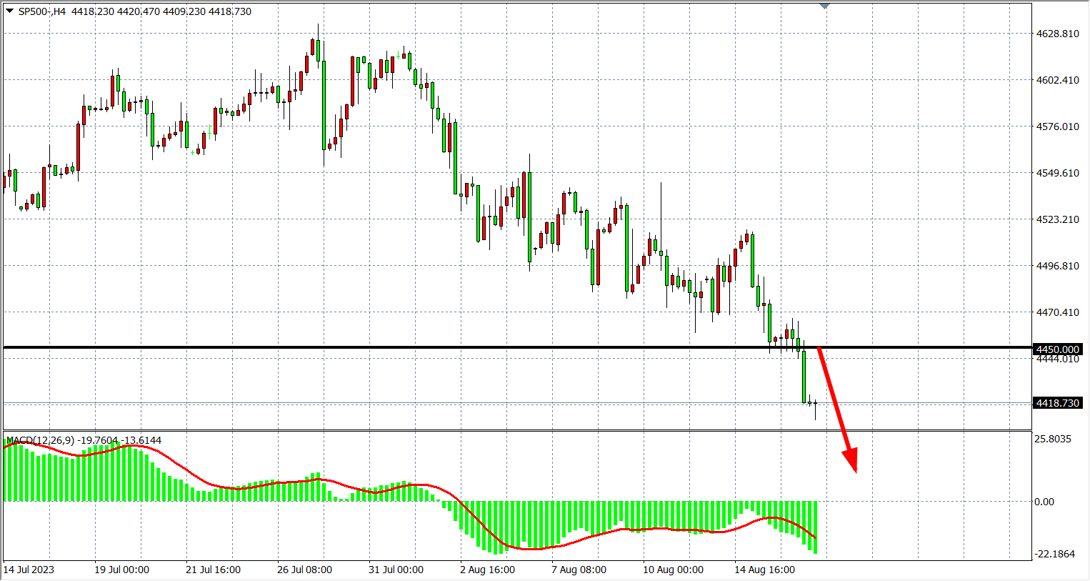 4小时图看,标普进一步跌破4450支撑,MACD量能在零轴下放量,行情走势仍较疲弱,阻力关注4450附近,支撑关注下方4400附近。