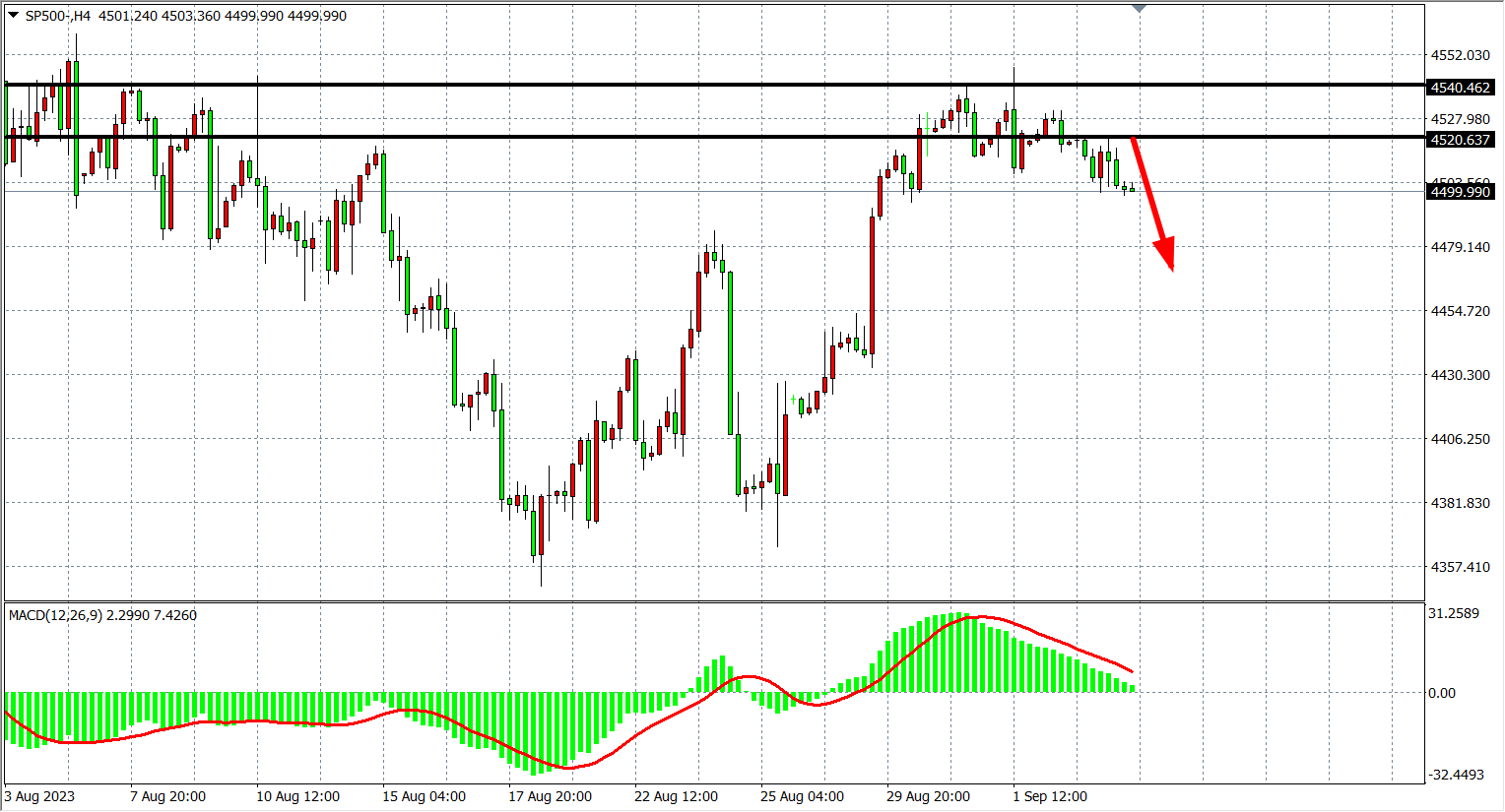 4小时图看,标普在4520之下弱势整理,MACD量能即将下穿零轴,行情延续走空,阻力关注4520-4540附近,下方支撑看4480-4450。