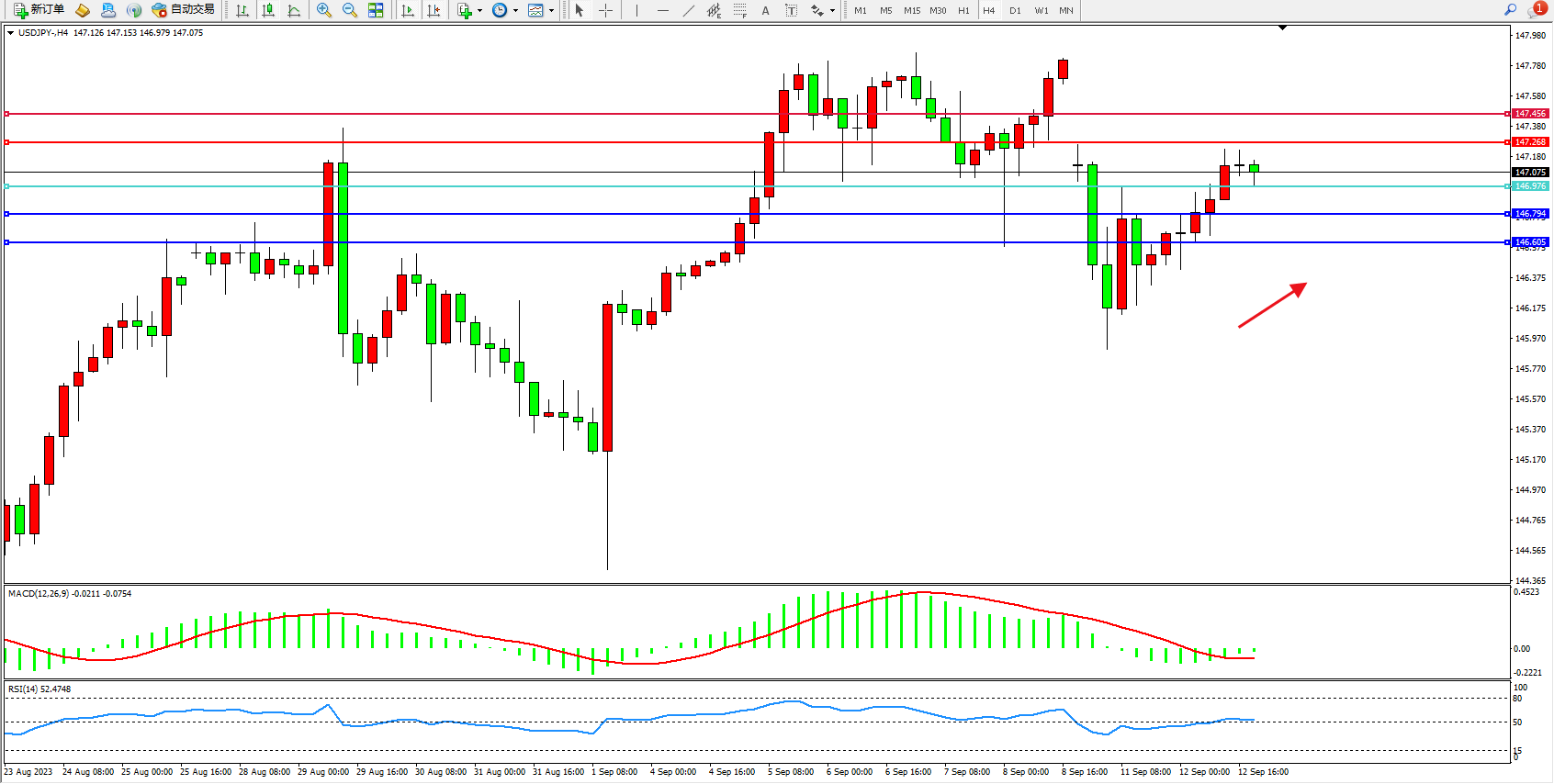 4小时图看:多头动力持续震荡上扬,短期看涨情绪笼罩,市场多头不断攀升,MACD指标处于0轴线下侧徘徊,RSI指标处于50均衡线附近弱势整理;