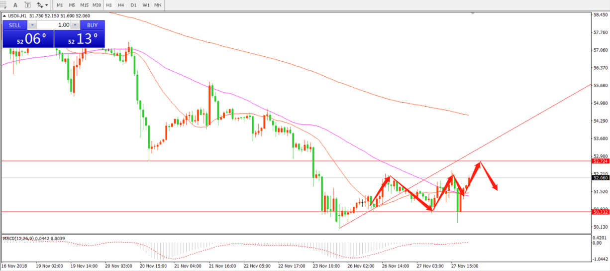 小时图看,50.60一线再次确认有效。API数据提振之下油价小幅反弹,价格目前整体位于,21和55日均线以上,MACD绿柱缩短,大方向整体偏弱的情况下,重点关注上方52.70一线做空机会。
