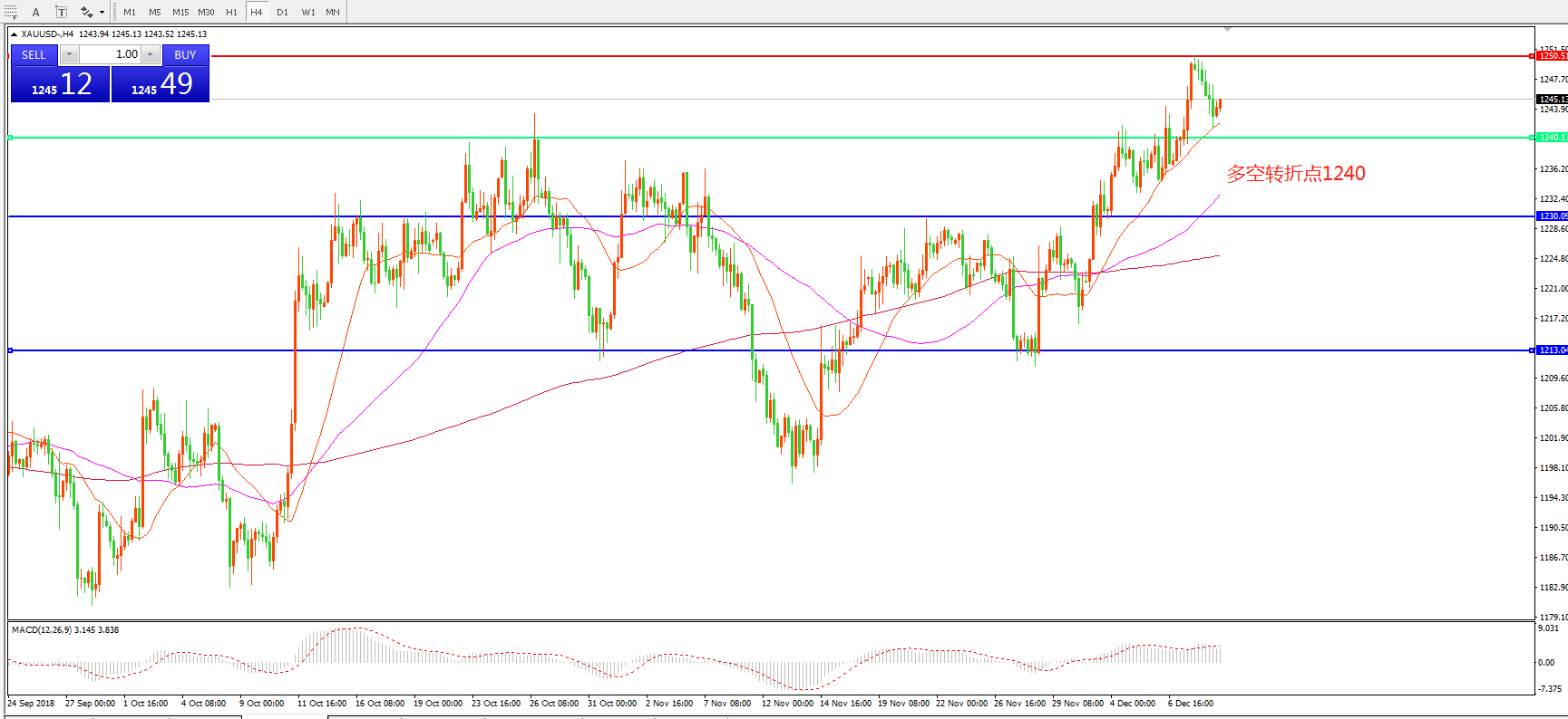 现货黄金周一(12月10日)转跌,金价在触及5个月高位1250.70美元/盎司后回落,震荡下行,美市盘中最低下探至1242.92美元/盎司,但整体仍运行在1240一线上方。