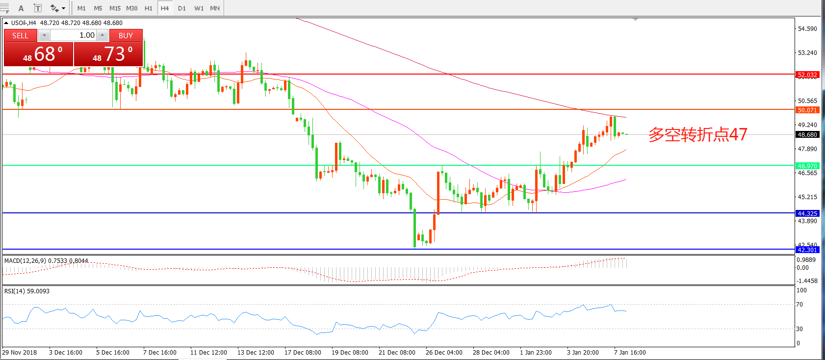 4小时图看,油价站稳47美金后稳步上行, 受200日均线压制小幅下行,MACD红柱增加,RSI指标拐头,短线依然是震荡反弹思路。